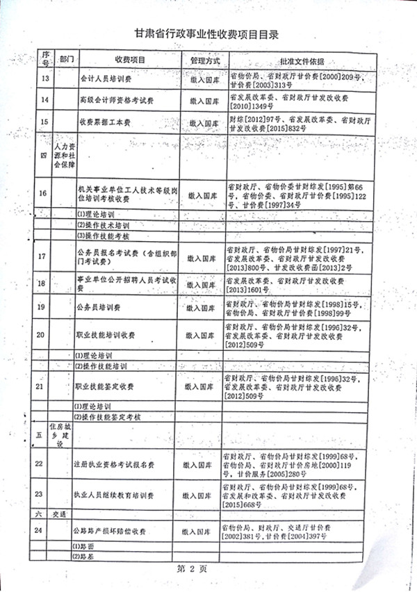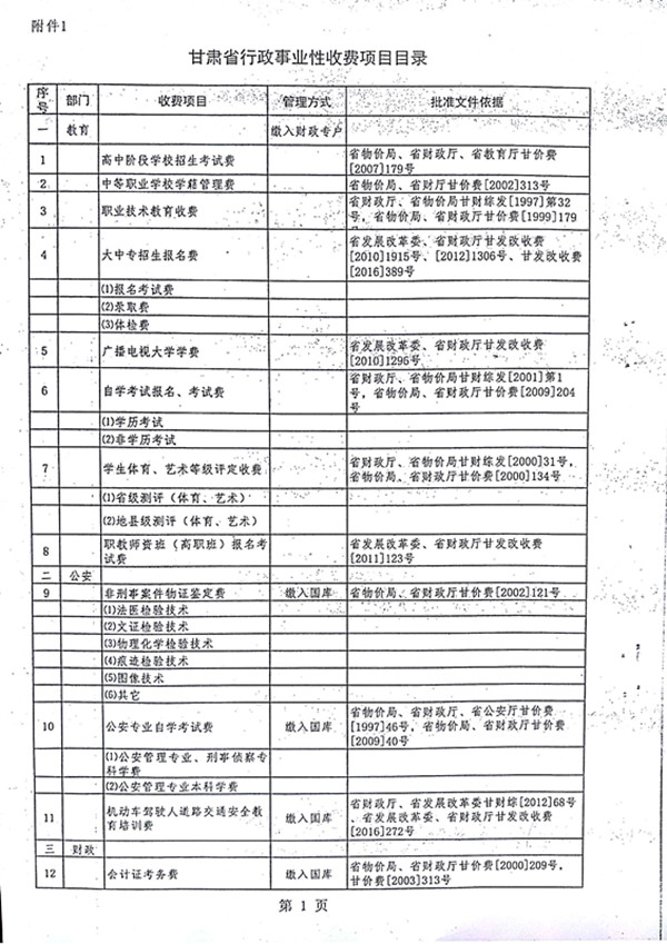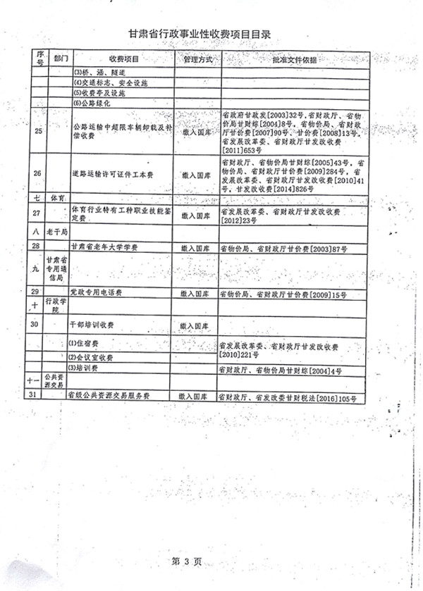 甘肃省行政事业性收费目录清单