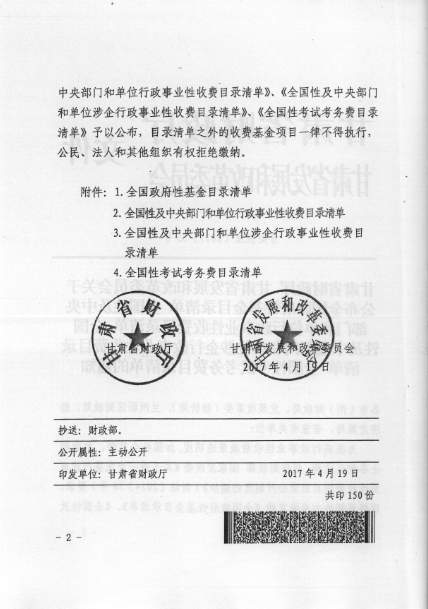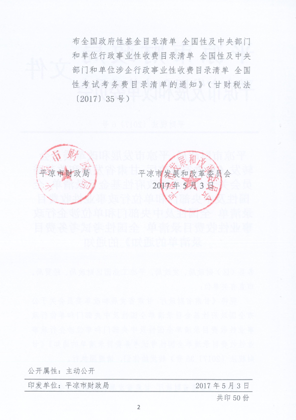 平凉市财政局 平凉市发展和改革委员会转发 《甘肃省财政厅 甘肃省发展和改革委员会关于公布全国政府性基金目录清单 全国性及中央部门和单位行政事业性收费目录清单 全国性及中央部门和单位涉企行政事业性收费目录清单 全国性考试考务费目录清单的通知 》的通知