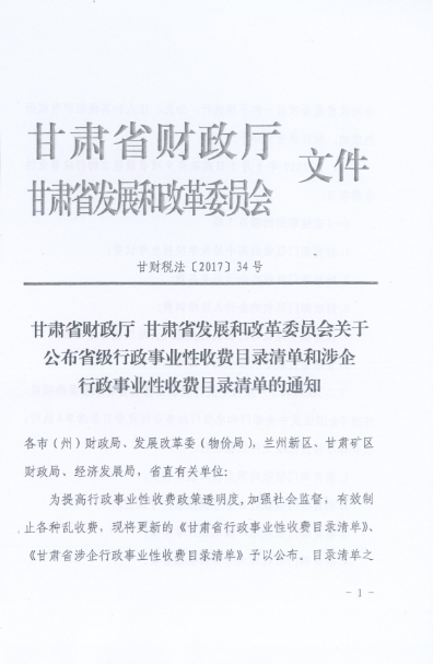 平凉市财政局 平凉市发展和改革委员会转发《甘肃省财政厅 甘肃省发展和改革委员会关于公布省级行政事业性收费目录清单和涉企行政事业性收费目录清单的通知》的通知